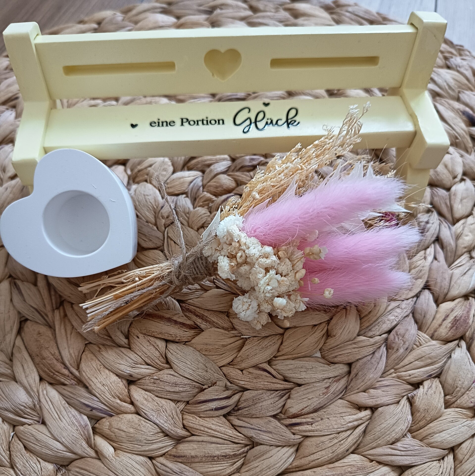 Eine Portion Glück, bestehend aus einer süßen kleinen Gartenbank und wenn gewünscht mit kleinem Kerzenständer und gern eine Kerze dazu.